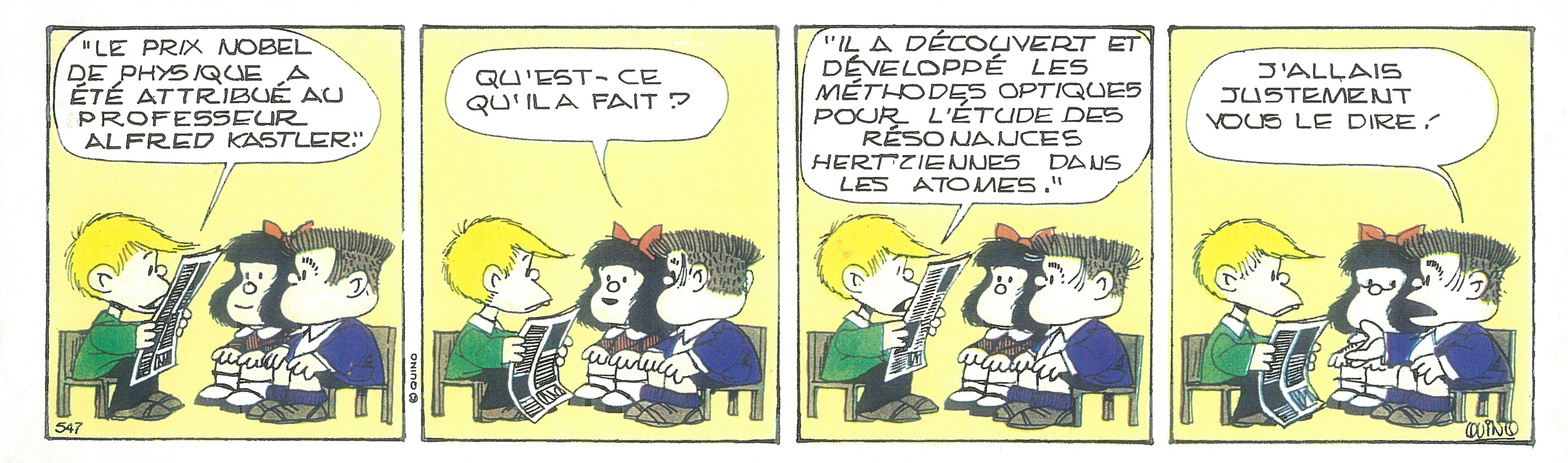 (« Recherches sur la fluorescence visible de la vapeur de mercure » by A. Kastler, Annales de Physique 11è série, Tome 6, Nov 1936). “My attention had been drawn to the relation between the polarization characteristics of the exciting and emitted radiation and the spatial orientation of the kinetic and magnetic moments of atoms.”